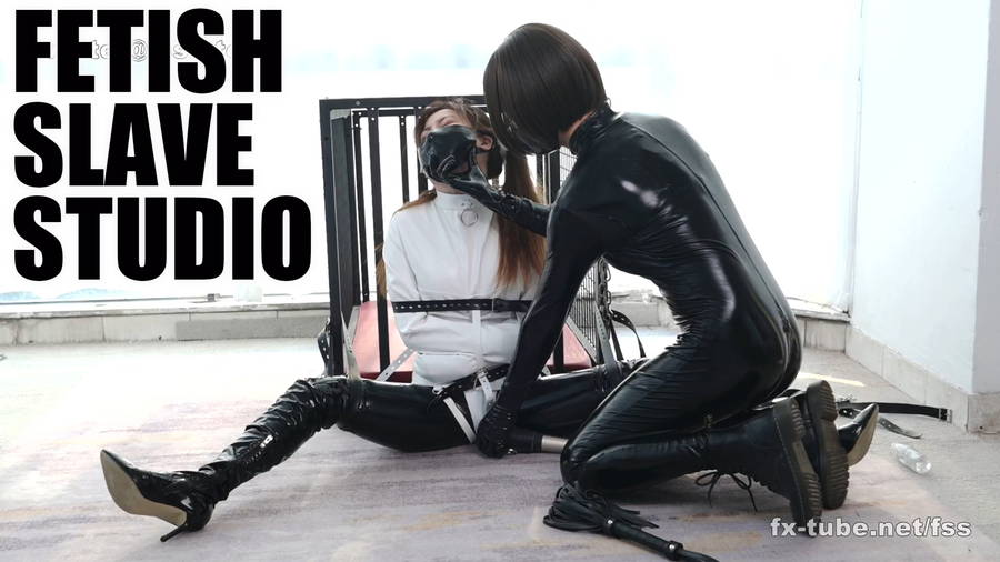 黒エナメルキャットスーツの上に、白エナメルを重ね着しているダブ。キキからの躾を受ける準備は万端です。キキはそんな彼女にさらに特殊服を着させ、動きを奪います。上半身はケージに、下半身は開脚状態でベルトで固定され、ダブは動けません。そんな彼女にキキは電マで快楽を与えていきます。終わらない快楽に絶叫するダブ。キキはそんな彼女にフードをどんどん被せていって…。